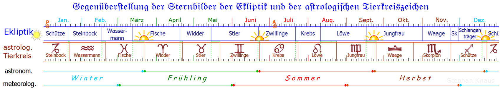 Zwei Dinge sind für jeden leicht nachvollziehbar: der Stand der Sonne auf der Ekliptik und die astrologischen Tierkreiszeichen: